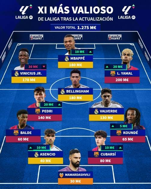 中场:佩德里(巴萨,1.4亿、上涨2000万)、贝林厄姆(皇马,1.8亿)、巴尔韦德(皇马,1.3亿)